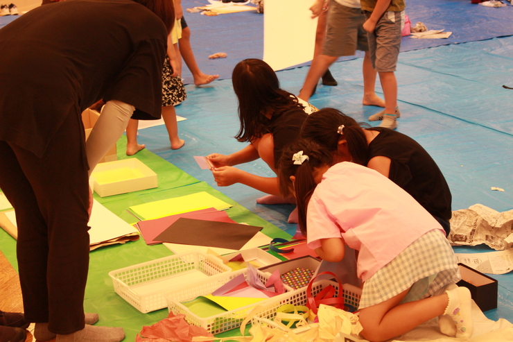 そしてお待ちかねの作品を創る時間。今回のワークショップでは、絵の具やペンだけでなく、木材の削りカスや毛玉、葉っぱなどいろんな素材を用意。子どもたちはそんな素材を破ってみたり、音を聞いてみたり、いろんな素材をくっつけてみたり…様々な素材に触発されて浮かんだイメージを形にしていき、それぞれが描くイメージを自由に表現し、驚くほど面白い作品を作ってくれました。