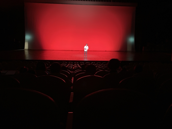 客席で中ホールについての説明を聞き、その後3つの舞台機構を組み合わせたショーを見学。そのショーの中で使われていた照明・音響・舞台という舞台の各機構についての説明を聞きました。