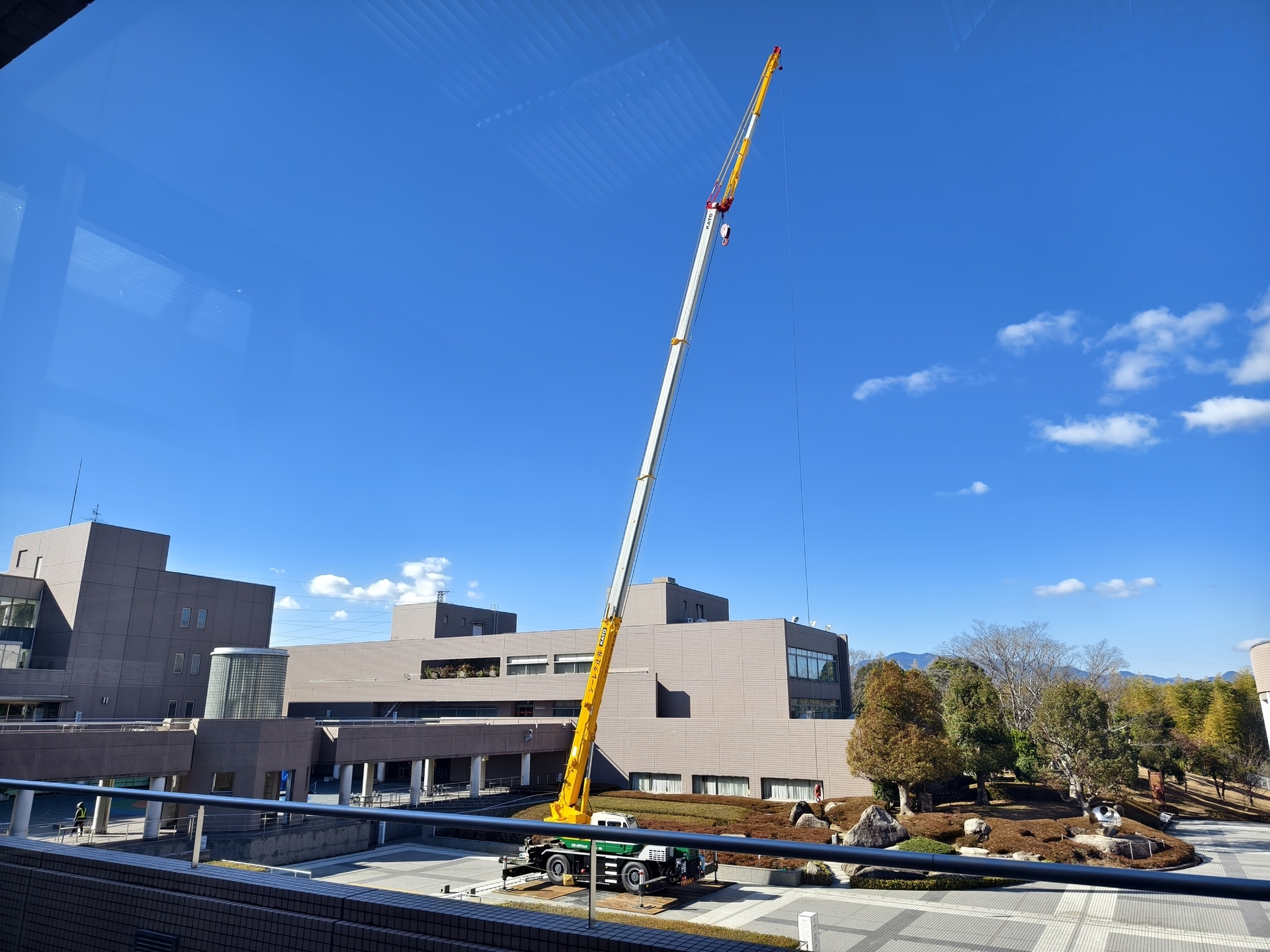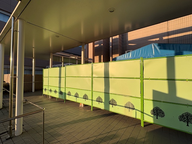 外側から見ると、工事しているようにはあまり見えない(1月10日時点)ですが、広場には囲いが立てられました。クレーン作業があるときはメインエントランスや広場に工事車両やクレーンが入ってきます。