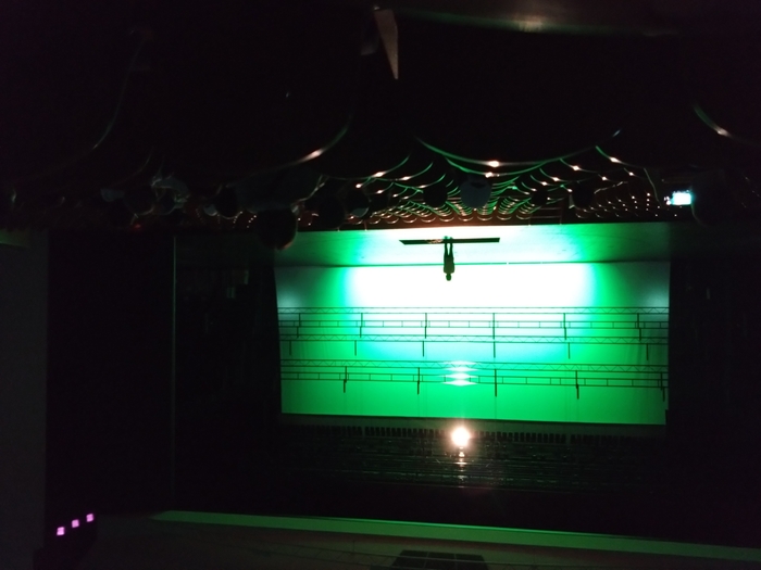 舞台が緑色に染まって、下から黒い影が・・・え、先生?