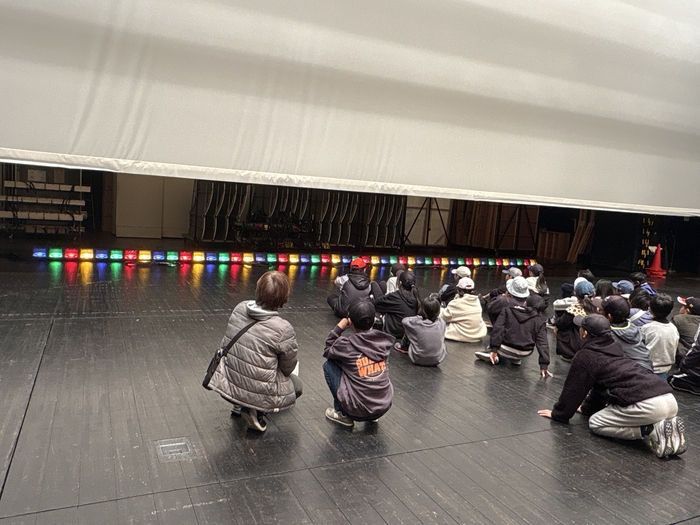まず、ホワイエでそうぶんと中ホールに関する説明を聞いた後、客席に移動して音響・照明・舞台の3つの舞台機構の動きを取り入れたショーを見学。