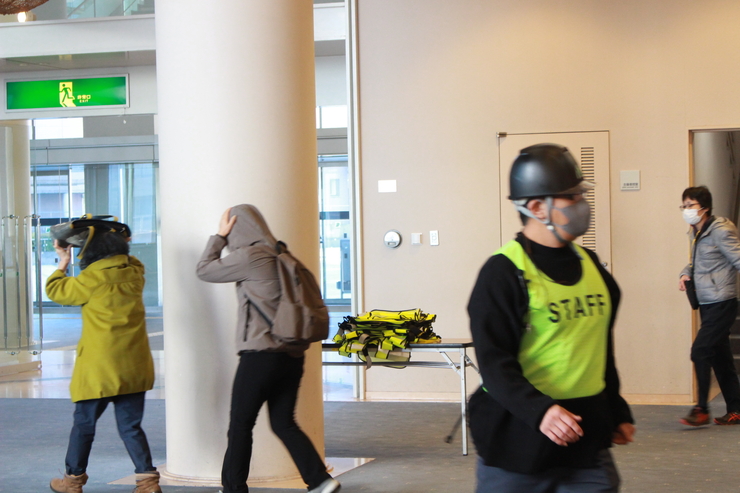 防災訓練に参加したボランティアの私たちは、観客の役をしました。実際に演奏者役のボランティアがピアノの演奏をしている時、大きな音(地震の音)が鳴り、コンサートは中断され、職員が大ホールから広場まで私たちを避難誘導しました。大ホールという大きな空間では、マイクを使えない状況で観客全員を安全に誘導するには、職員の冷静な判断と連携、可能な限りの大きな声での呼びかけは必須ですが、私自身、観客役を体験して考えたことは、観客や出演者も含め、日頃の災害に対する意識を高めることが必要だと思いました。