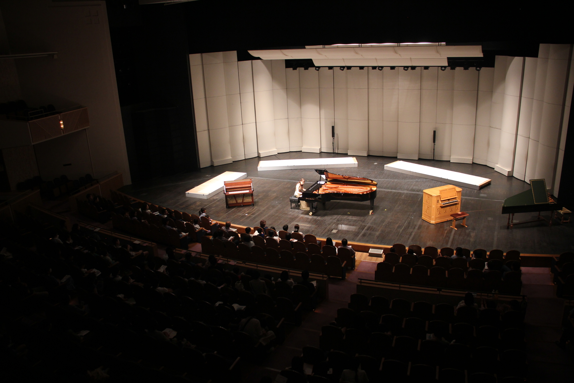 第1部では、三重県文化会館所蔵の鍵盤楽器・ポジティブオルガン、チェンバロ、ピアノ、チェレスタを舞台上に並べました。小学生は舞台上の特設客席に座って、ピアニスト・高橋ドレミさんの話を聞いたり、実際に楽器に近づいて演奏している様子を観察したりしました。レクチャーの中では「ピアノとチェンバロの演奏を聴いてみてどんな違いがあったか?」など、小学生のみんなに意見を求める場面もありましたが、積極的に手を挙げて意見を出してくれました。