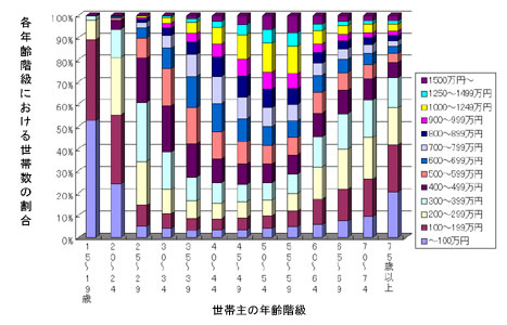 高度成長期の大量消費の担い手であった団塊の世代は、現在引退期を迎えています。図1は総務省統計局が2002年に調査した世帯主年齢階級別の世帯所得の分布を示したものです。この図から、若年層と高齢層の世帯主世帯では高額所得世帯の割合が少なく、所得分布は壮年層の世帯主世帯に比べて大きくないことがわかります。ただし図1はフローの所得を見たもので、金融資産などストックを含めて考えると、高齢者ほど所得格差は拡大しています。