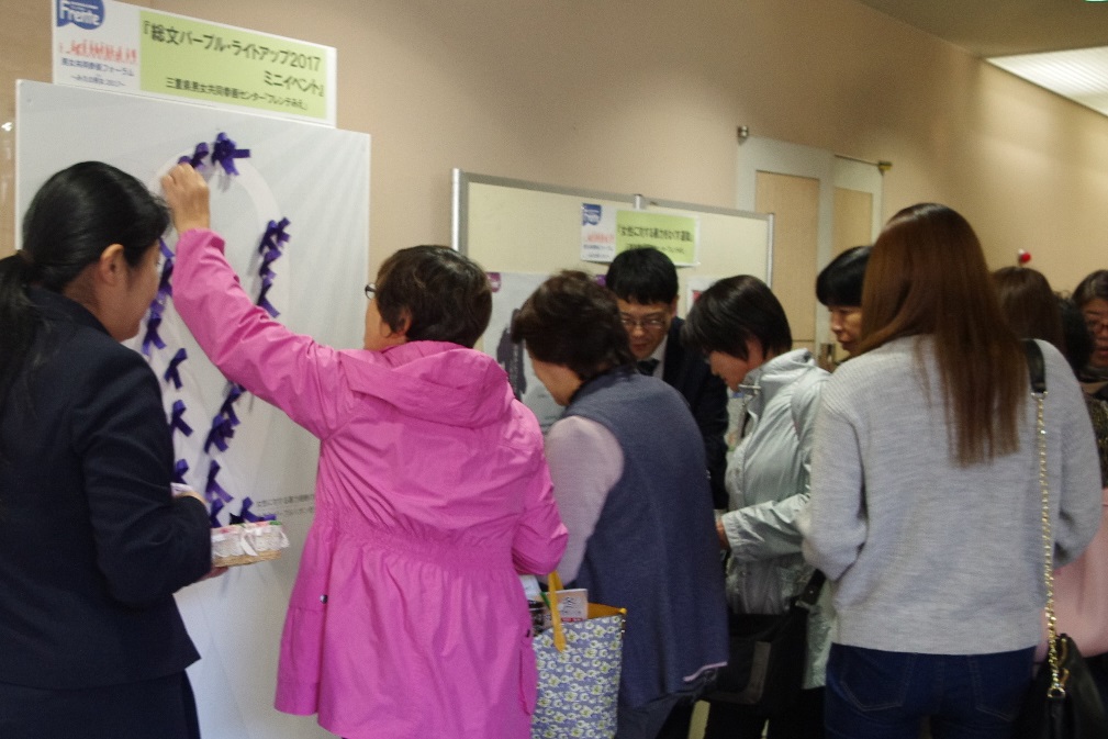 3年目を迎える今年は、パープルライトアップ会場である、三重県総合文化センター祝祭広場のほか、2017年11月11日(土曜日)に開催した「男女共同参画フォーラム みえの男女(ひと)2017 減災・復興と男女共同参画」や、11月19日(日曜日)に開催した女性のための暴力防止セミナー「一人芝居 電話の女」の会場などへも出張し、ミニイベントを開催しました。一人ひとりが小さなパープルリボンをパネルに貼り、みんなで大きなリボンを作ろう!というこのミニイベントには、多くの方にご参加いただき、最終日までにのべ442名の皆様による大きなパープルリボンを完成させました。