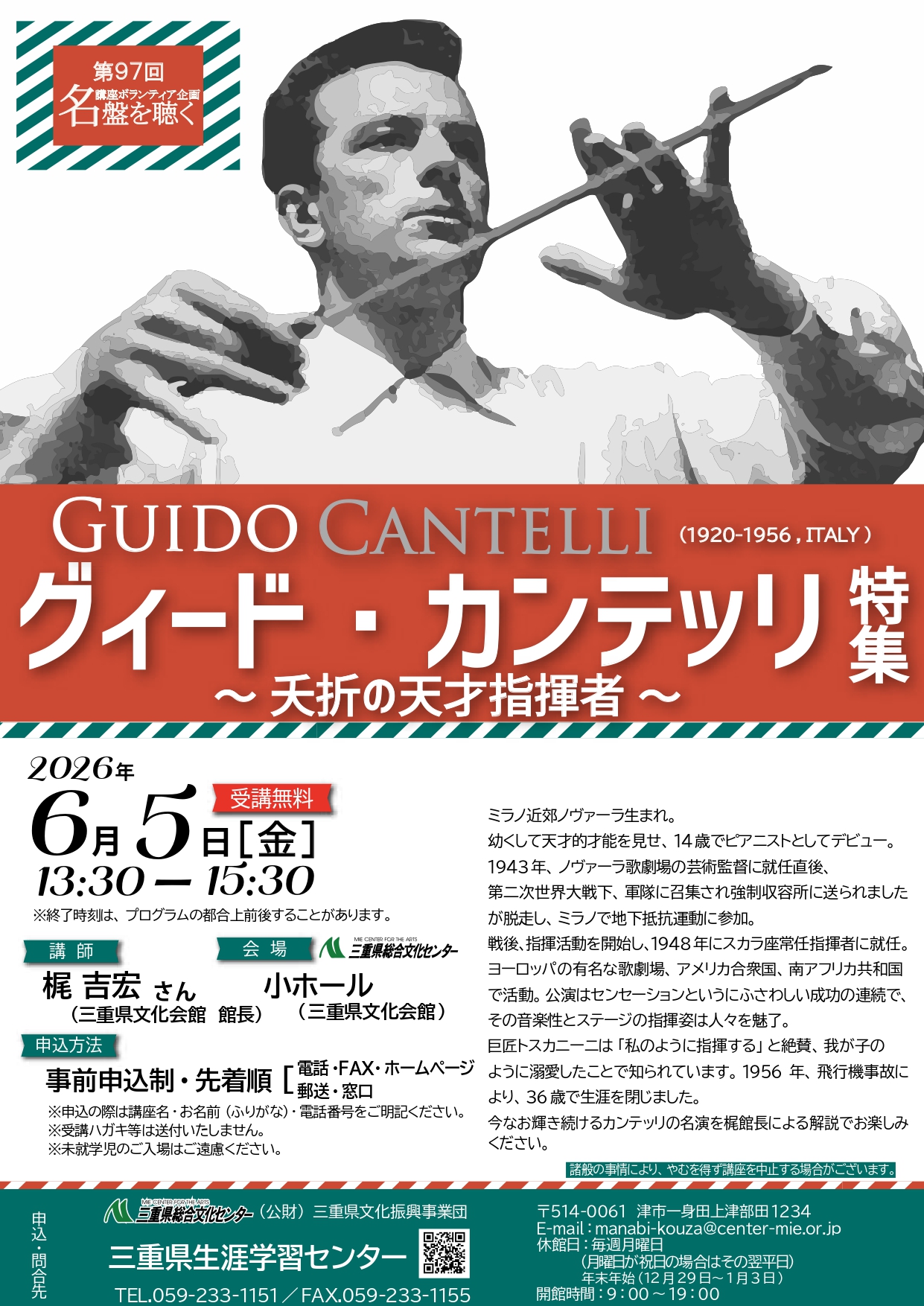講座ボランティア企画 第97回名盤を聴く グィード・カンテッリ 特集 を2026年6月5日(金曜日)に開催します。