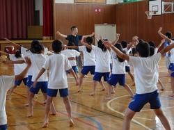 最初は準備運動からです。大きな声で数を数えて飛んだり、ストレッチしたりして、体を十分にほぐしました。楽しそうに見えますが、実はとってもきつい!子どもたちは息があがっていました。