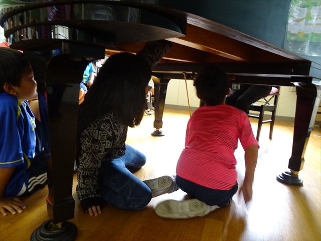 まずは鍵盤の動きがわかるアクションモデルでどのように音が出ているのかを理解しました。そして弦の上に紙コップを置いて鍵盤を叩くとどうなるか試したり、響版の上にオルゴールをのせて響きを聴いたり、ピアノをくぐって下の板に触れ音の振動を感じたり、たくさんの実験でピアノについて学びました。