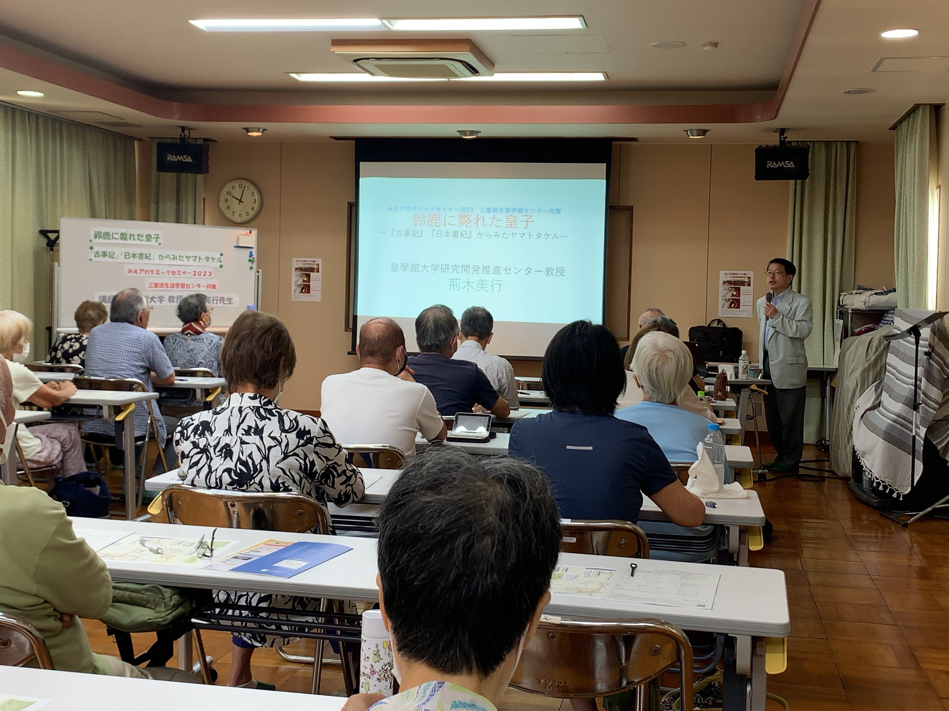 みえアカデミックセミナー2023移動講座の第1回目は、鈴鹿市立旭が丘公民館にて、皇學館大学 研究開発推進センター 教授 荊木 美行(いばらき よしゆき)さんを講師にお招きして公開セミナーを開催しました。