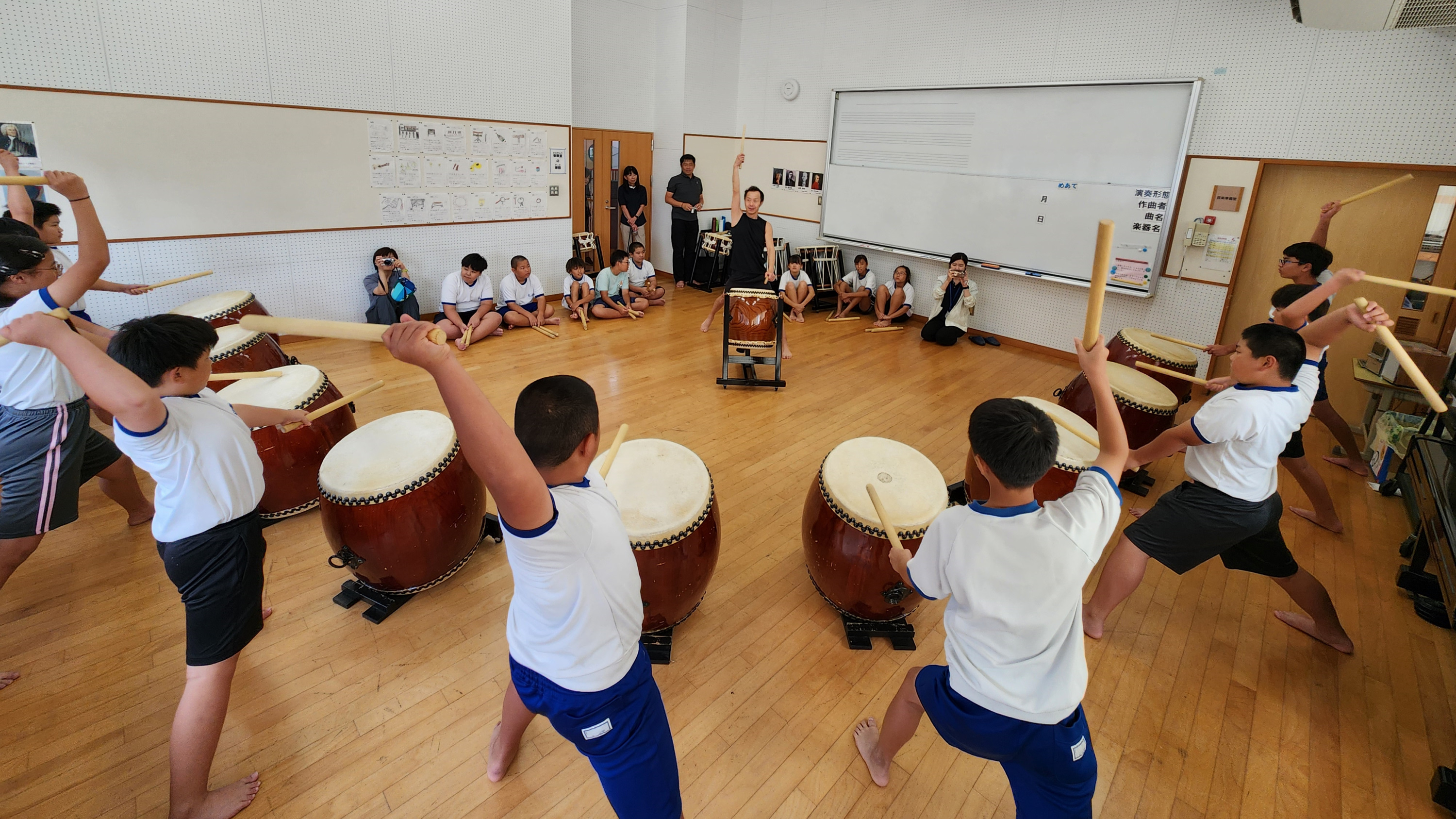 講師の先生のていねいでわかりやすい指導によって、どの子も夢中で太鼓演奏に取り組み、最後には圧巻のコラボ演奏をすることができました。