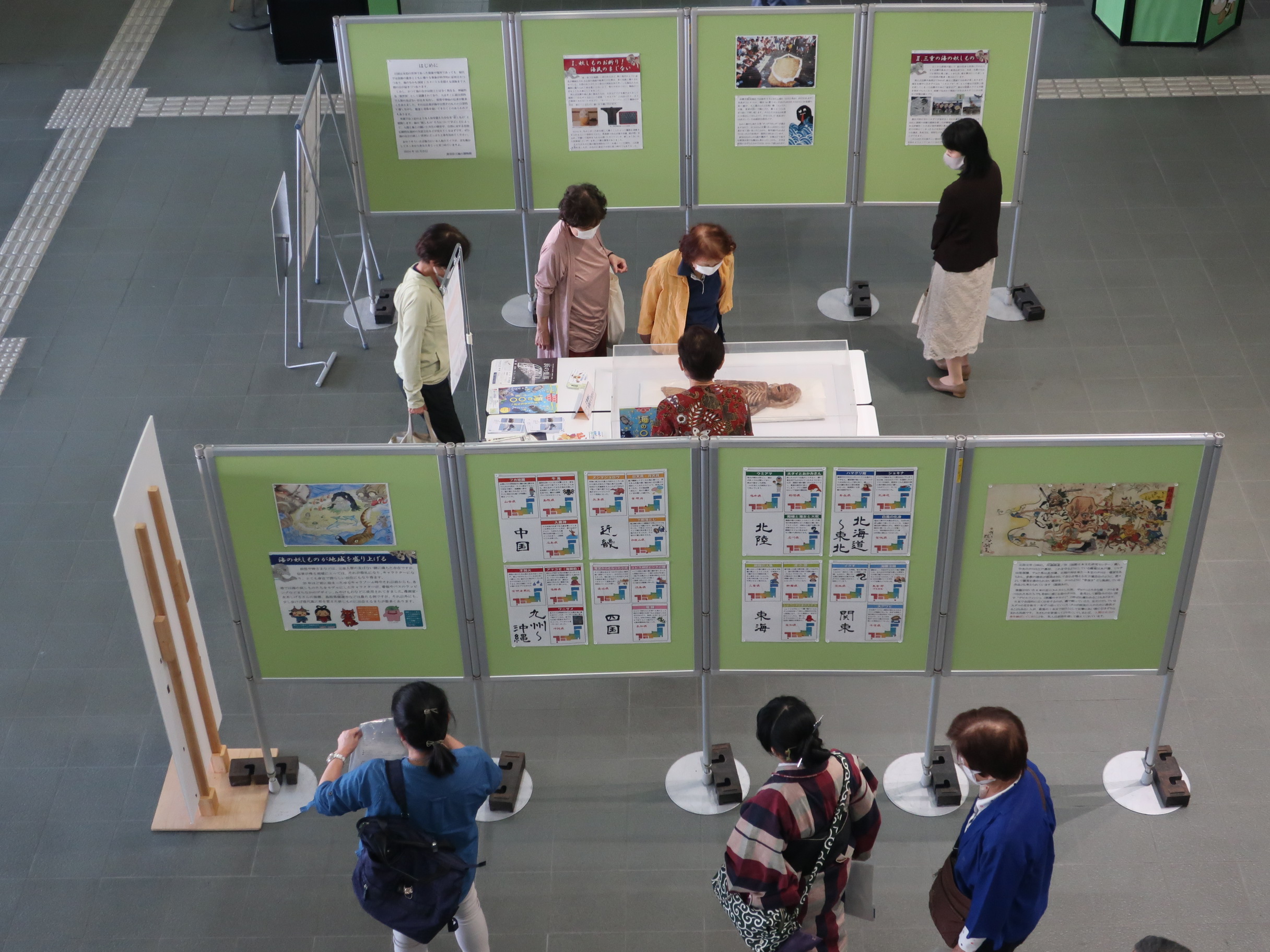 講師の縣さんは、「海の妖怪の伝承はたくさんあり、話の中には、現代失ってしまった歴史であったり、慣習、信仰などが隠れており、自然と共生していくための教訓が潜んでいる。先人たちが残してくれた教訓をぜひ読み取ってみてほしい。」と締めくくられました。パネル展示には、人魚のミイラの模型が展示されておりたくさんの方が興味深くご覧になっていました。