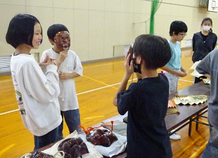 - お面をつけさせてもらったときや、狂言での笑い方の指導されたときは大変楽しそうな様子でした。(先生)