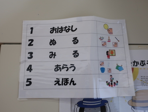 - えほん(講師の絵本『ピーナッちゃんとドーナッちゃん』のお話を聞く)