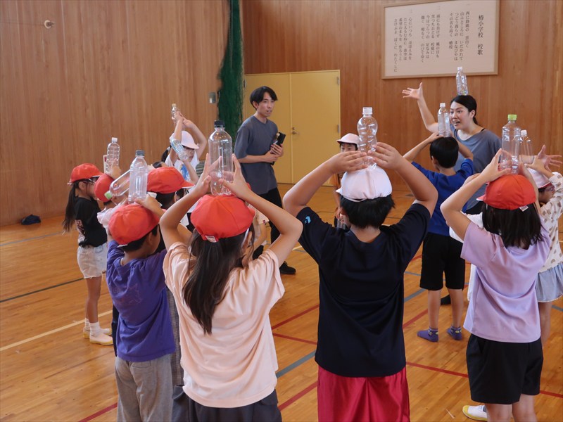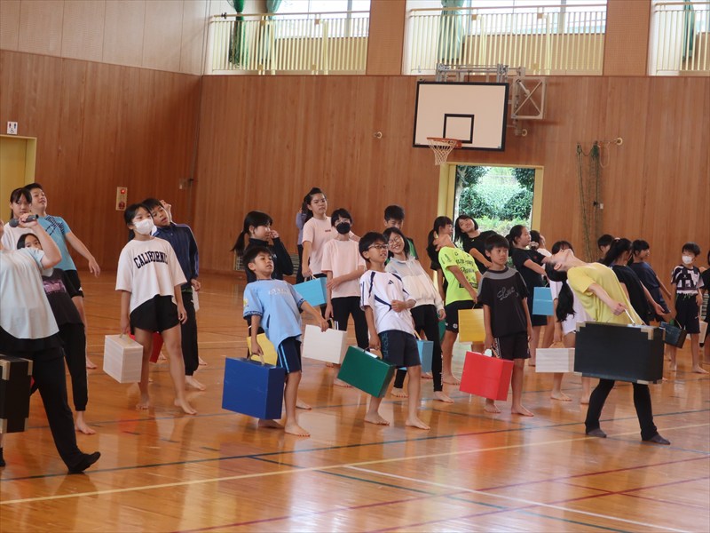 グループごとに分かれて創作する場面では、ペットボトルを頭にのせたり、みんなで輪になってじゃんけんしたり楽しそうに講師と一緒に相談していました。