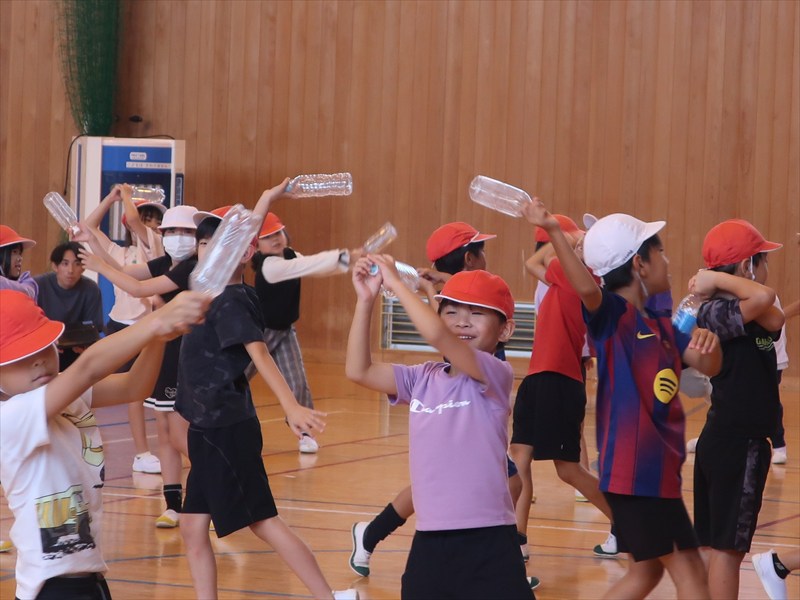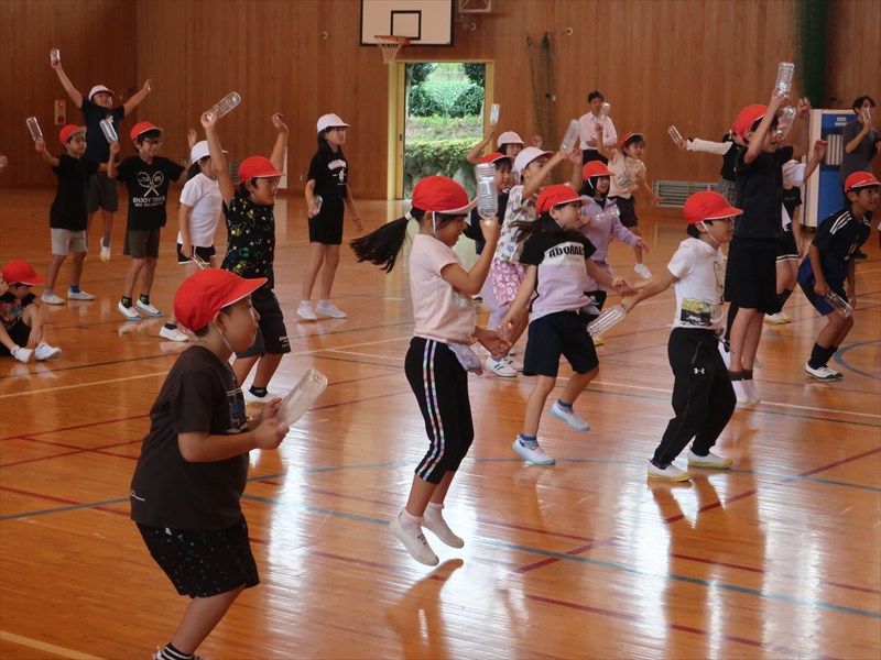 運動会での披露へ向け、2時限目、低学年はペットボトルを手に「マジック」を、3時限目、高学年は段ボールで作った自分だけのトランクを手に「小さな旅人」をテーマにそれぞれダンスをしました。