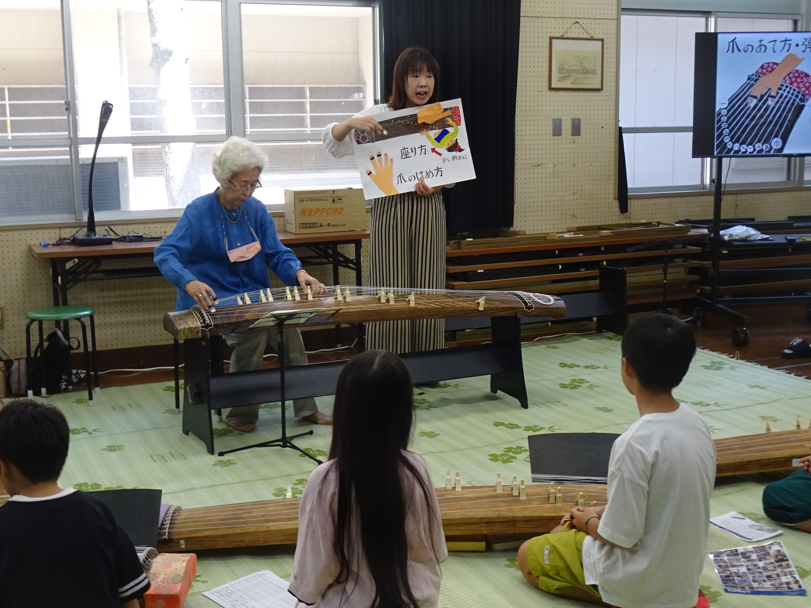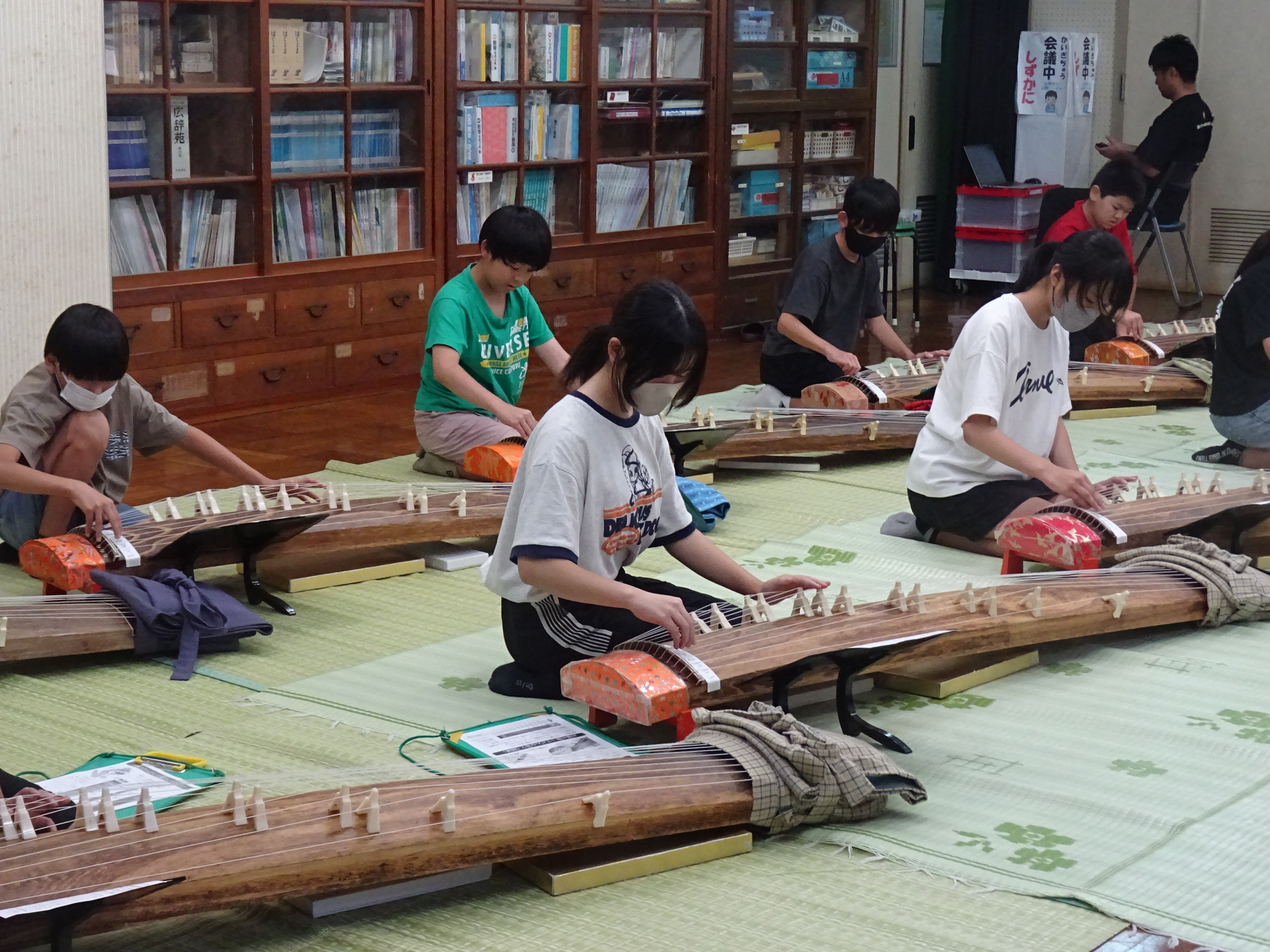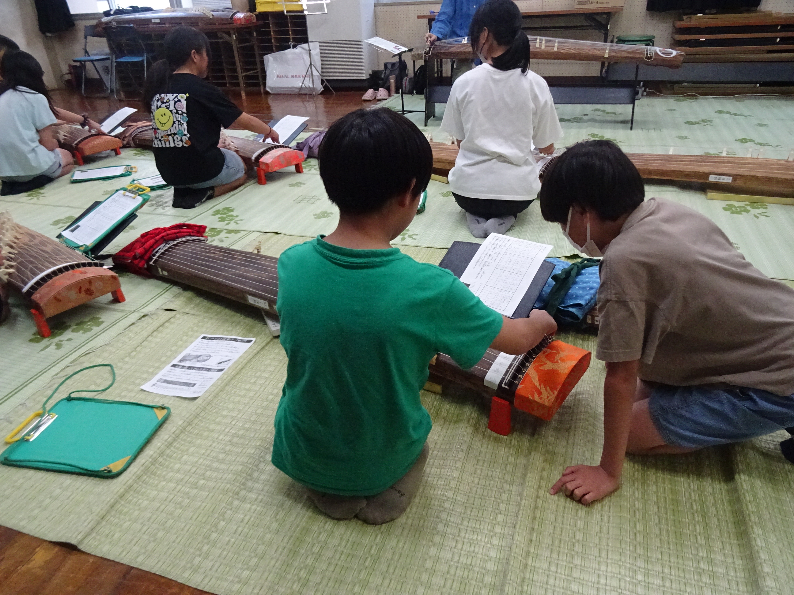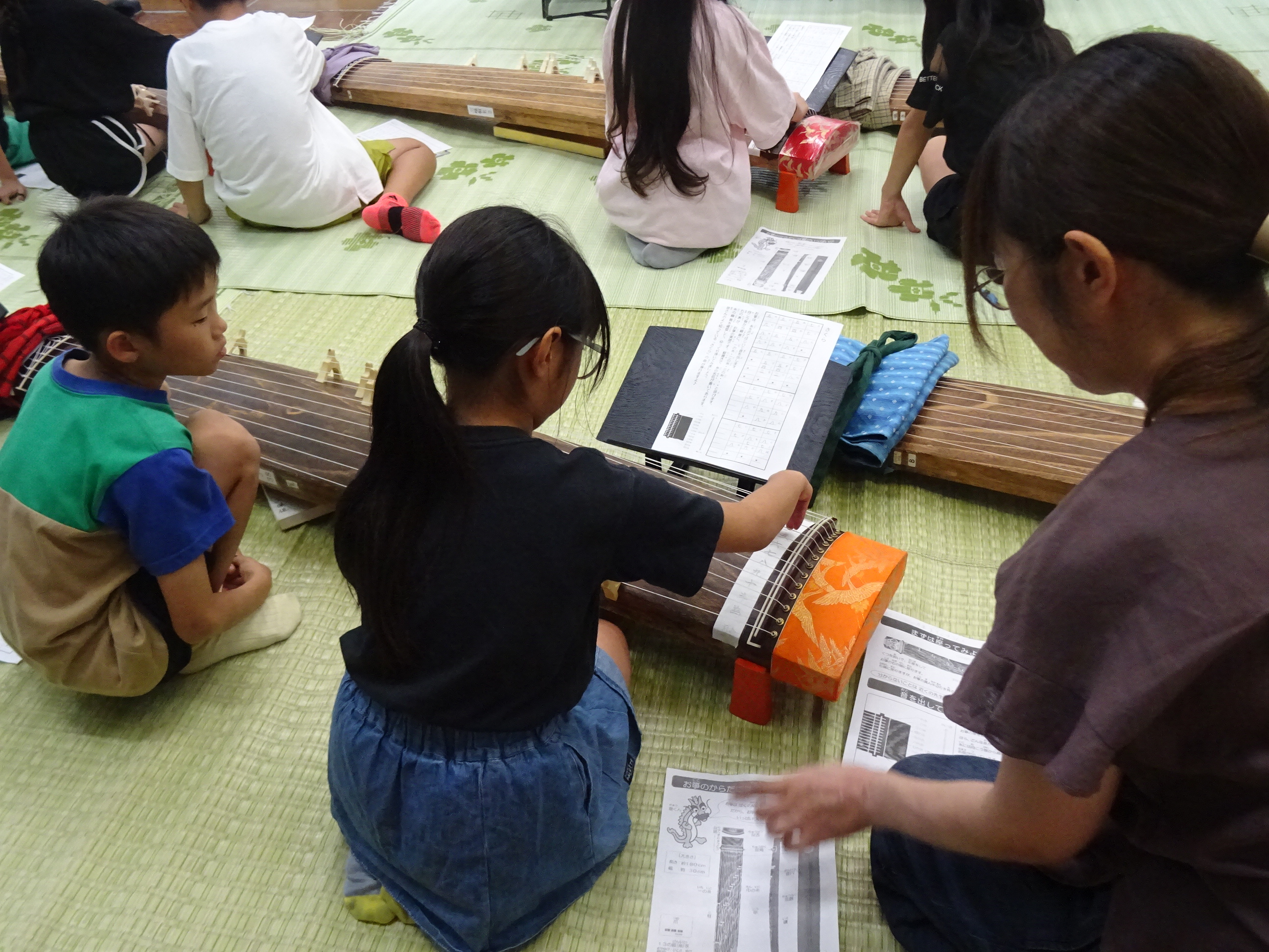 子どもたちは、講師のアドバイスを受け、助け合いながら楽しそうに演奏していました。練習を重ねるごとに上手になり、講師の演奏に合わせてお箏のきれいな音が教室に響きました。