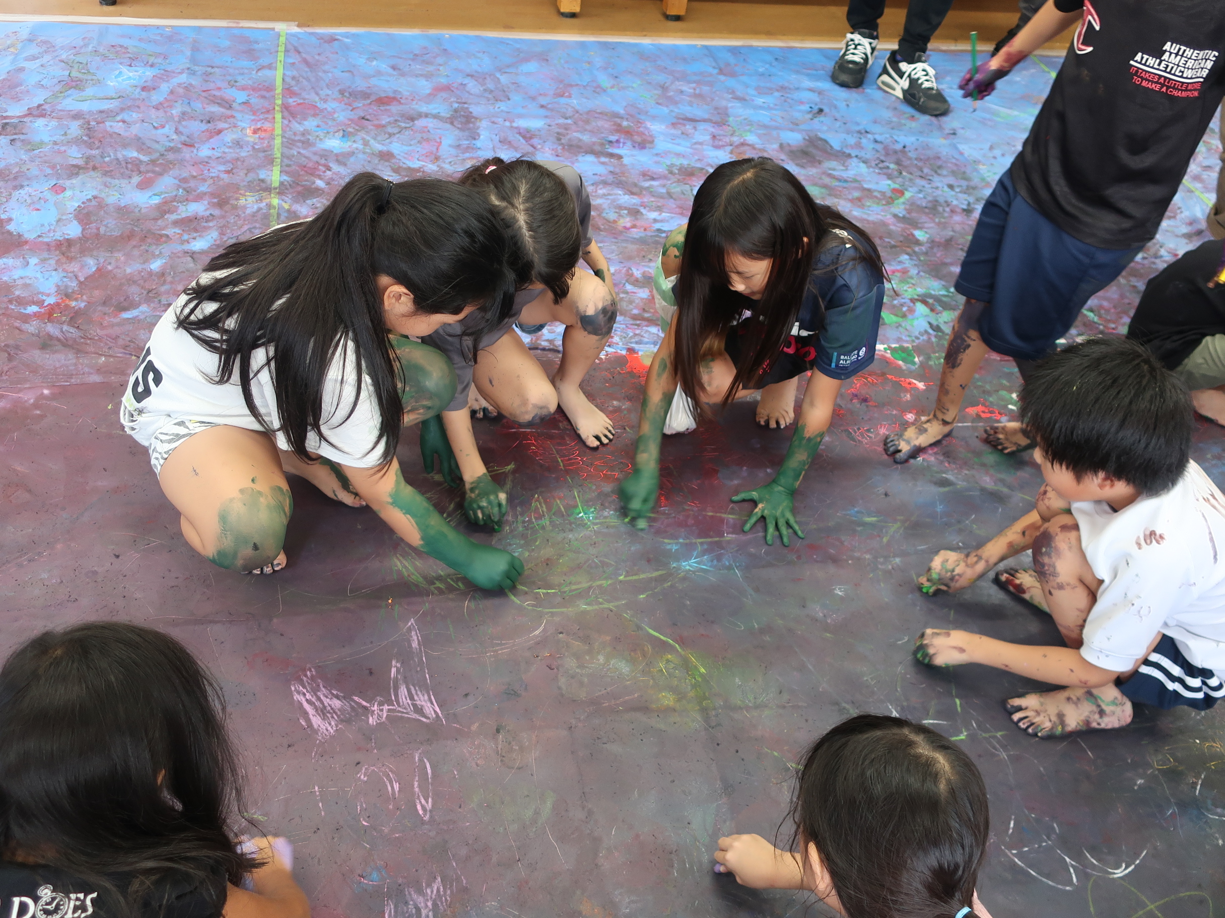 子どもたちは夢中になって真っ白な紙に絵を描き、みるみるうちに綺麗な絵の具でいっぱいになりました。