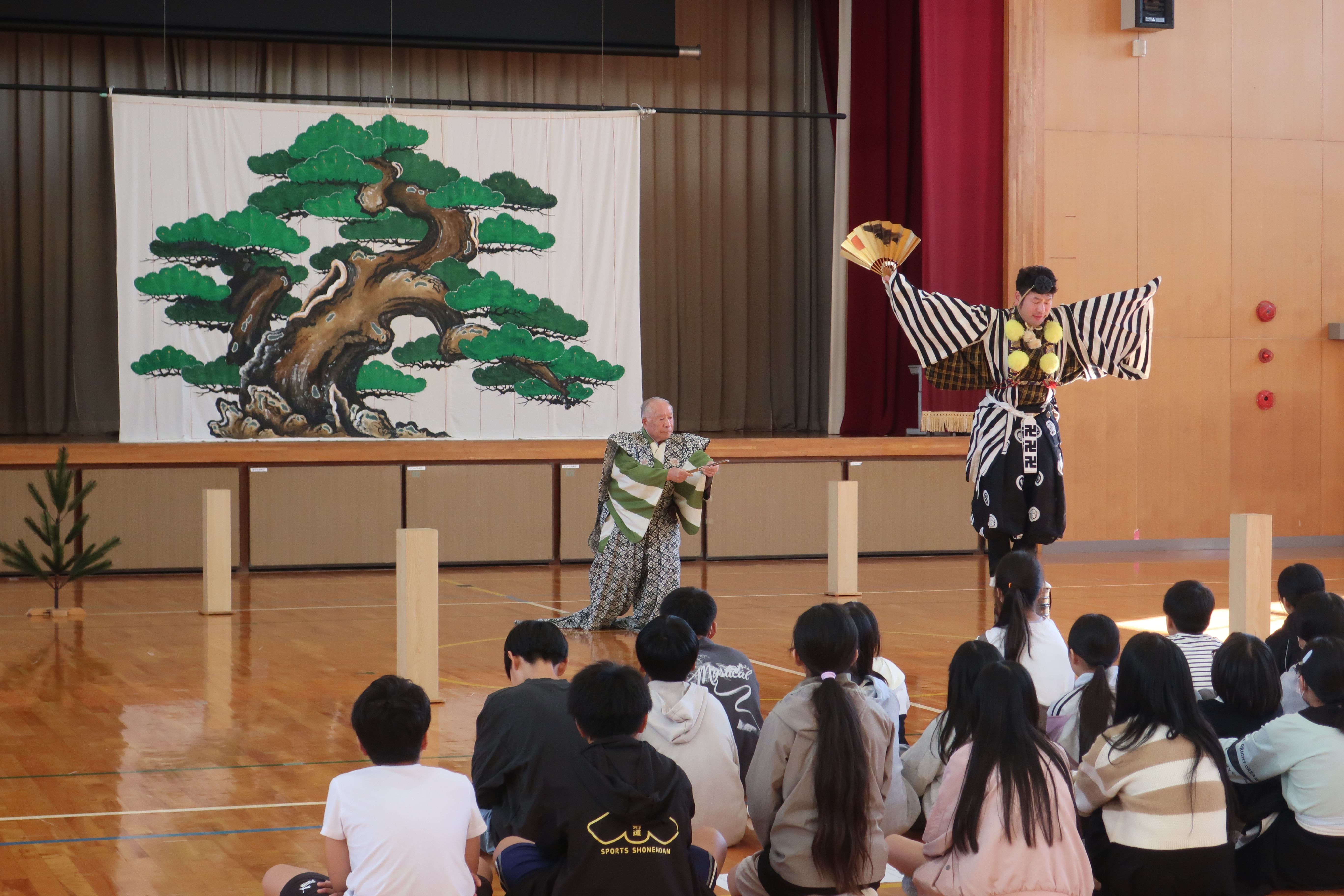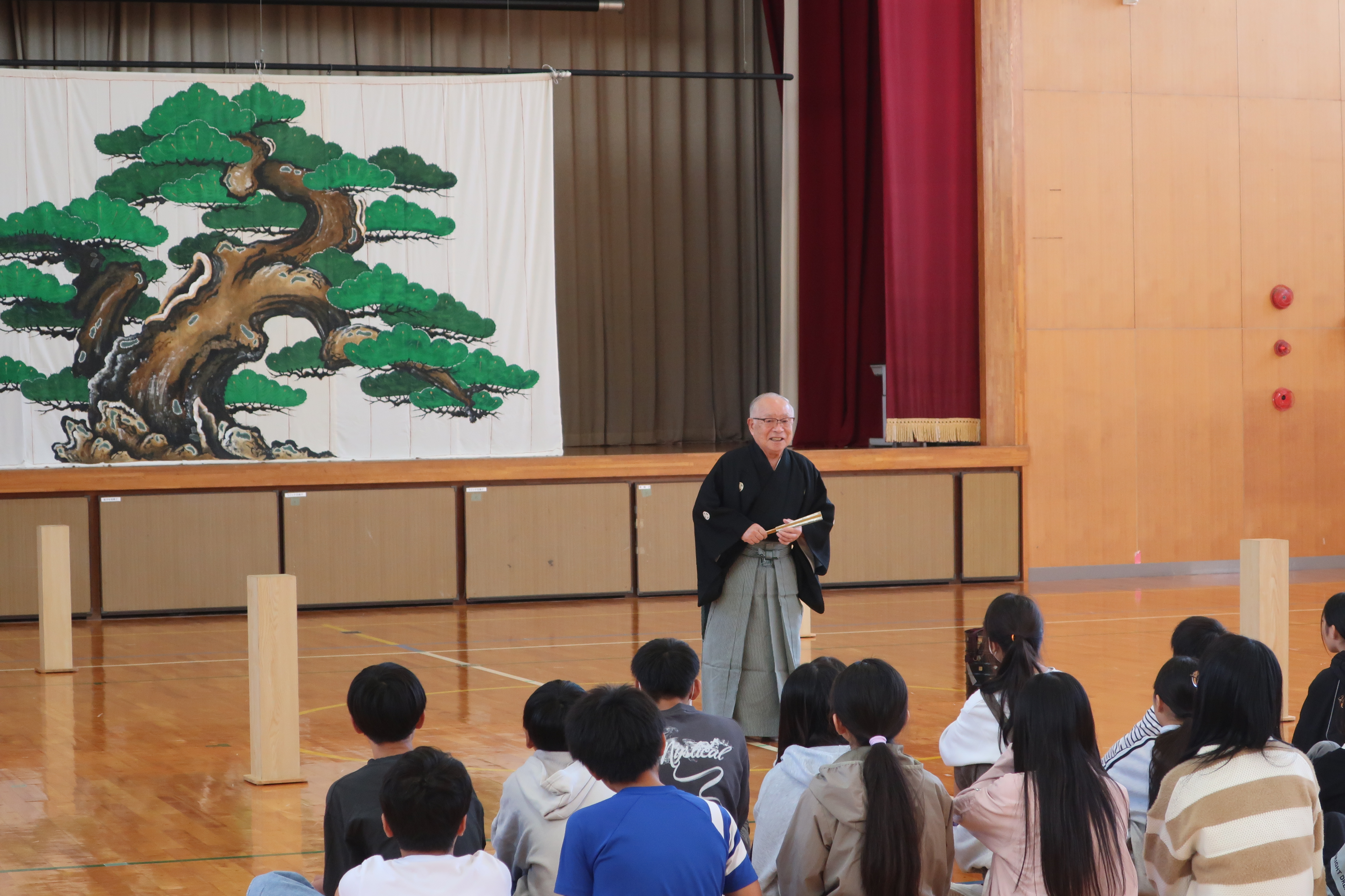 講師の自己紹介や、狂言の「笑い」や「泣き」の表現方法、歴史、舞台装飾についての説明を、子どもたちは興味津々で聞いていました。