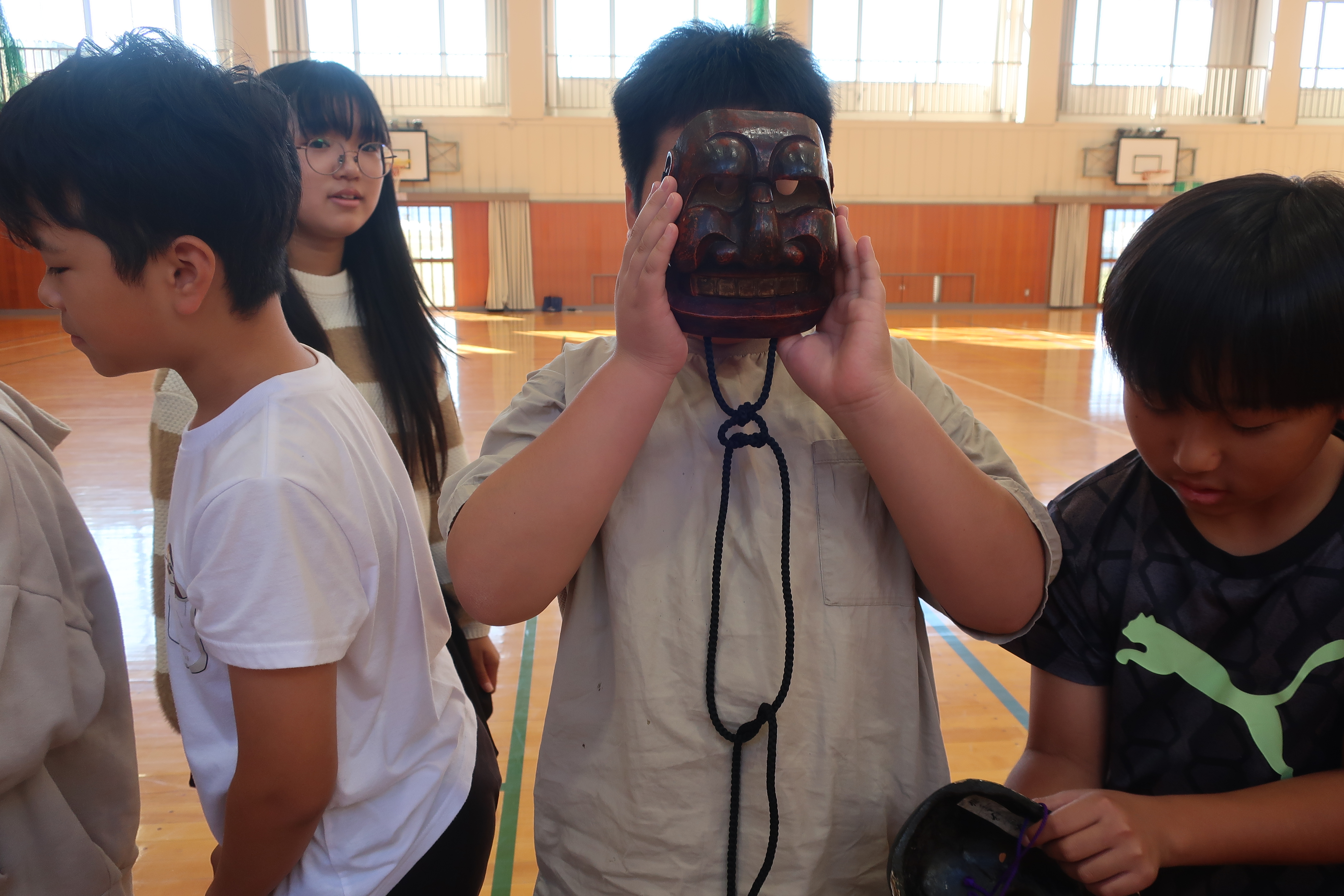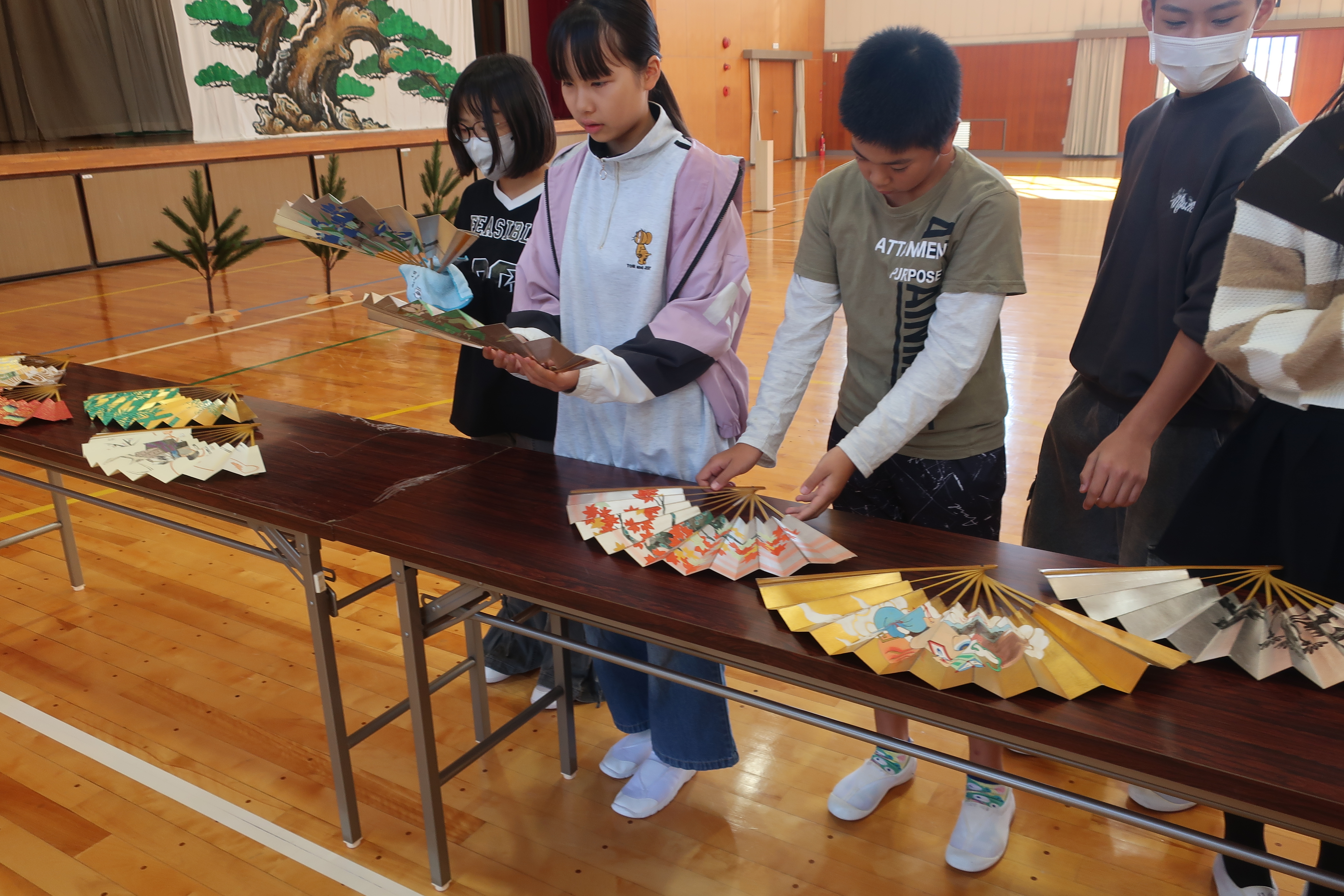 お話を聞いた後は歴史ある扇や面を鑑賞しました。実際に手に取り、触れることで狂言にますます興味を抱いているようでした。