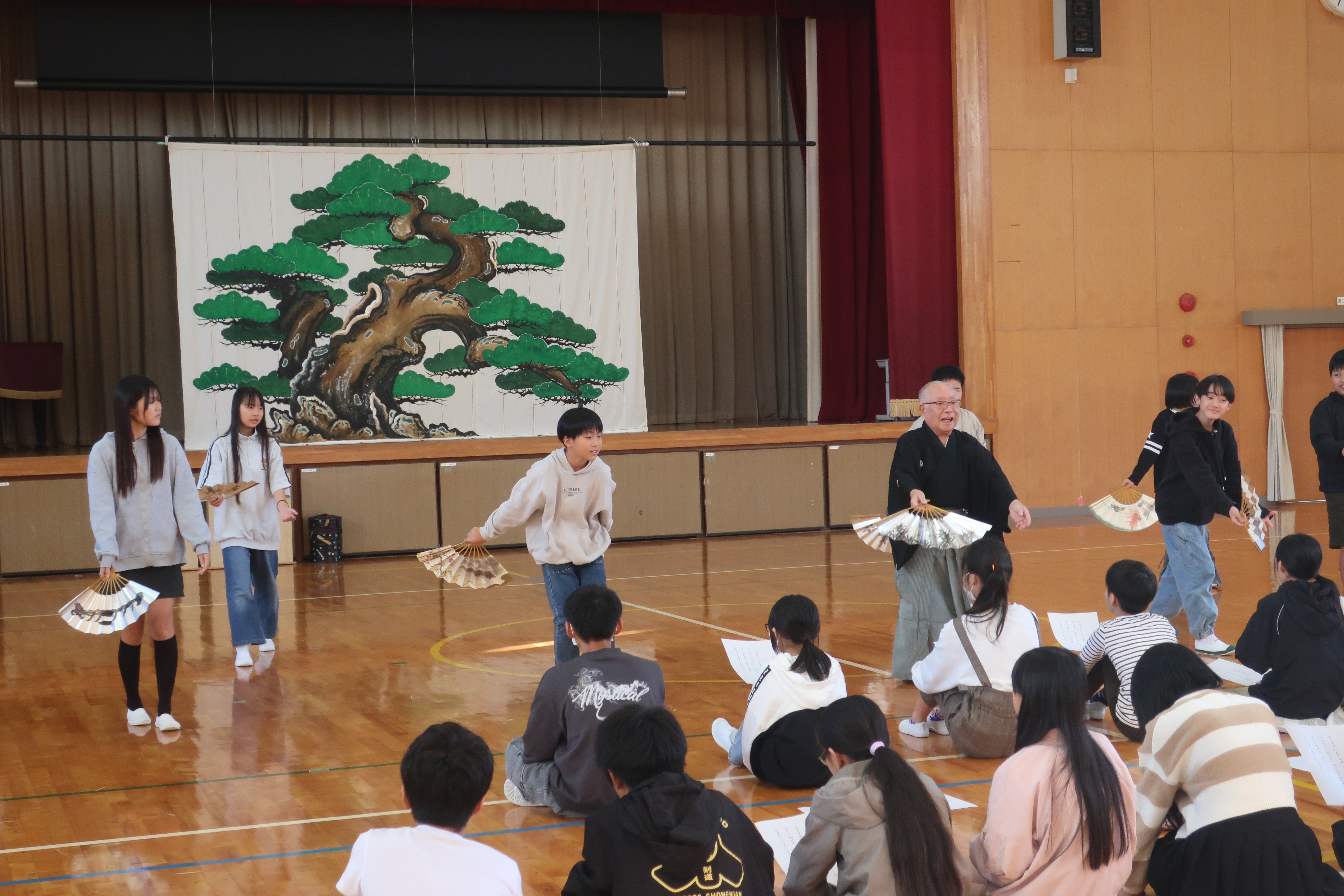 最後に狂言の「笑い」の体験をして、体育館は「わーはっはっは」と、狂言の笑い声に包まれ、授業は終了しました。