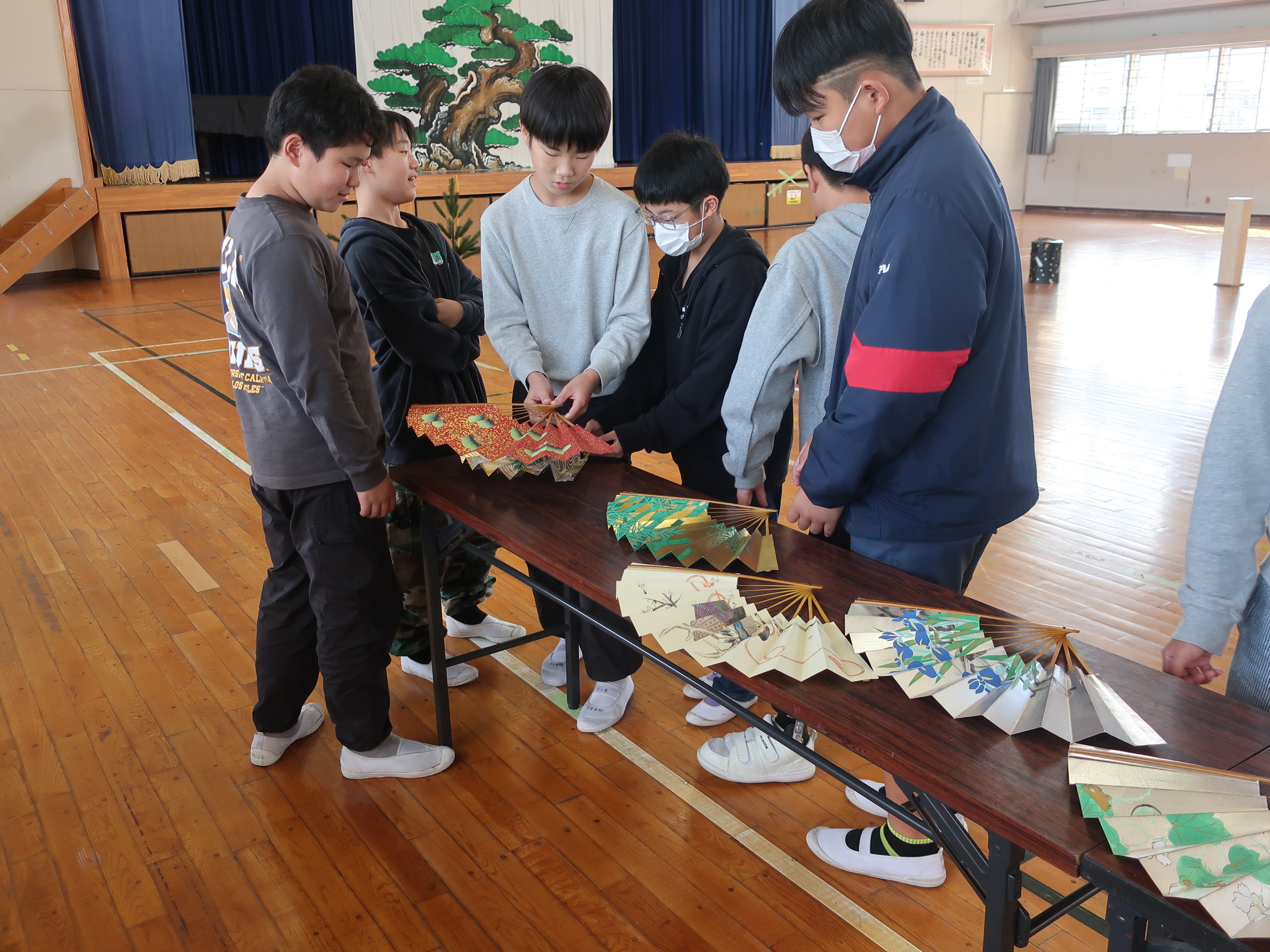 説明の後は貴重な狂言の面と扇の鑑賞です。めったに見ることのできない舞台道具に子どもたちは興味津々な様子でした。