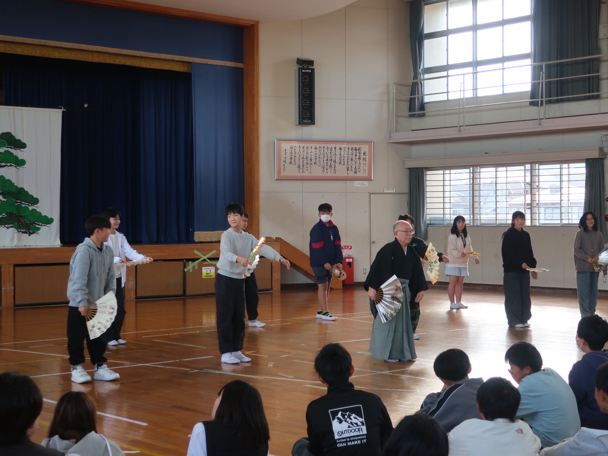 授業後半では、講師と一緒に小舞「盃」を体験しました。扇子を持ち、講師の謡とともに、講師の動きに合わせて舞う子どもたちは楽しそうでした。