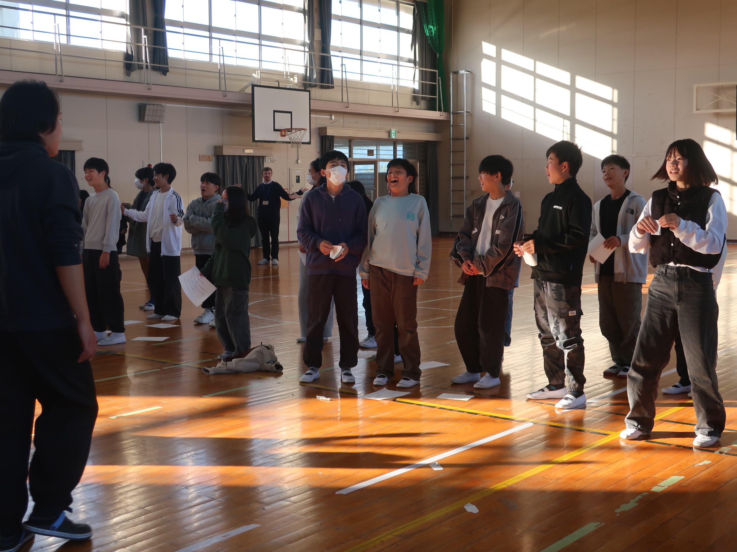 最後には、狂言の「笑い」を体験しました。担任の先生たちが「笑い」をする姿をお手本に子どもたちも「笑い」の体験をして、授業は終了しました。