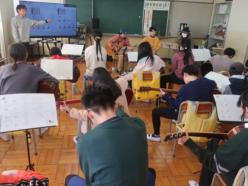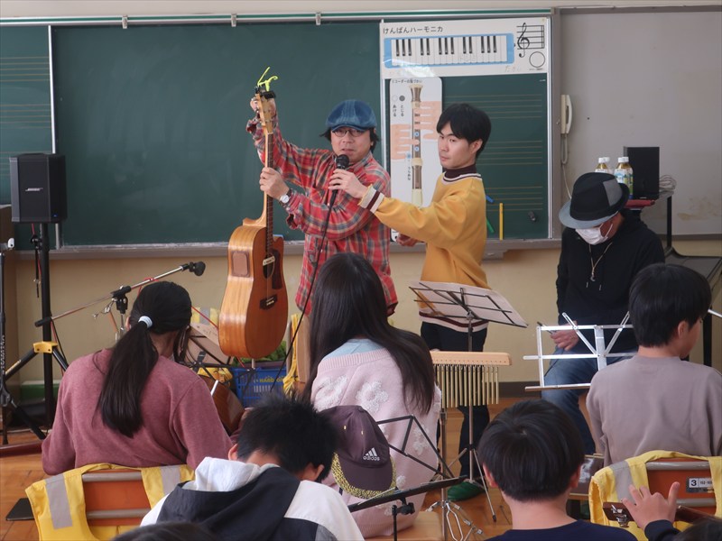 明和町立大淀小学校6年生のみなさんにギターとカホンのプログラムをお届けしました。
