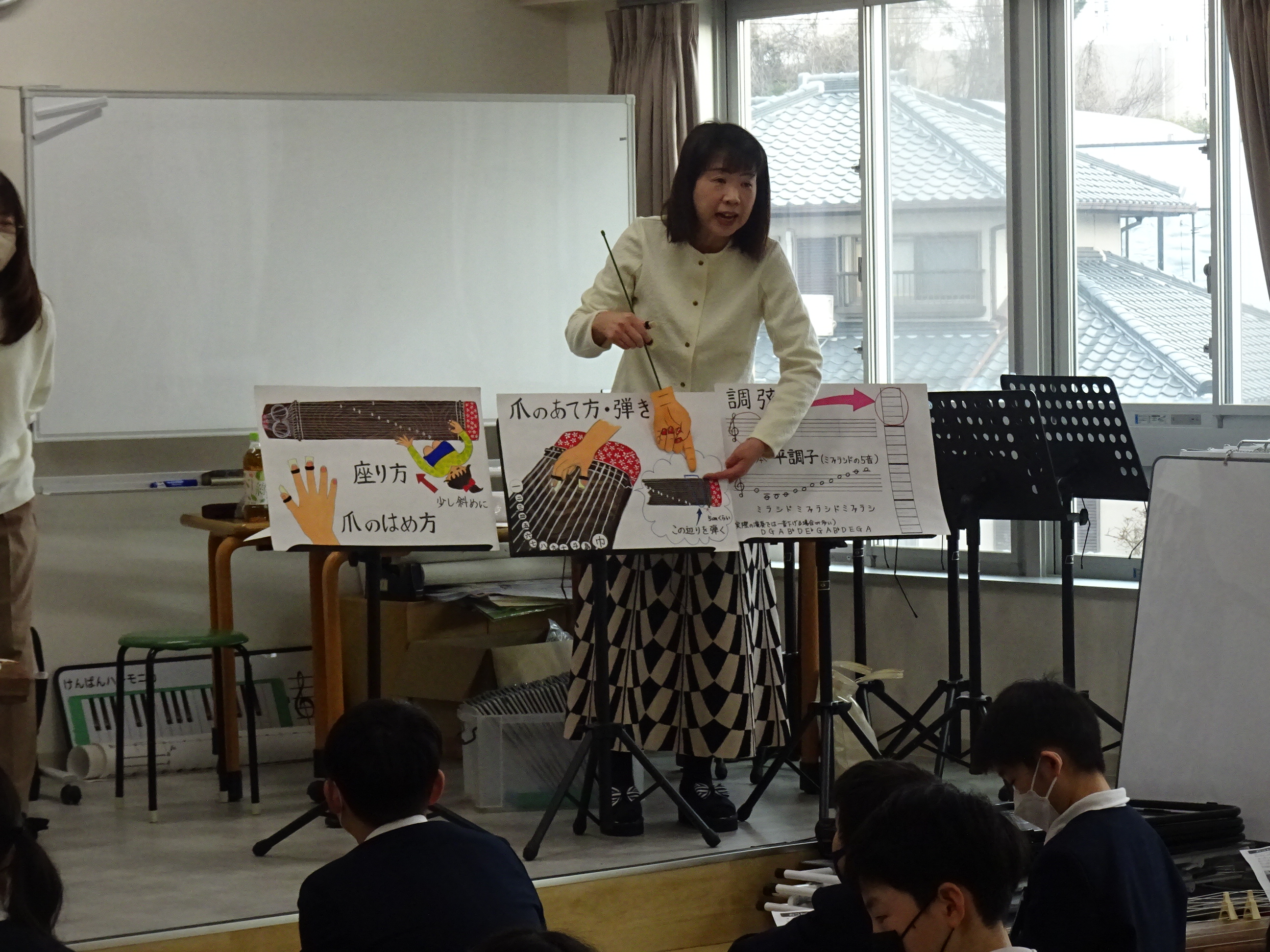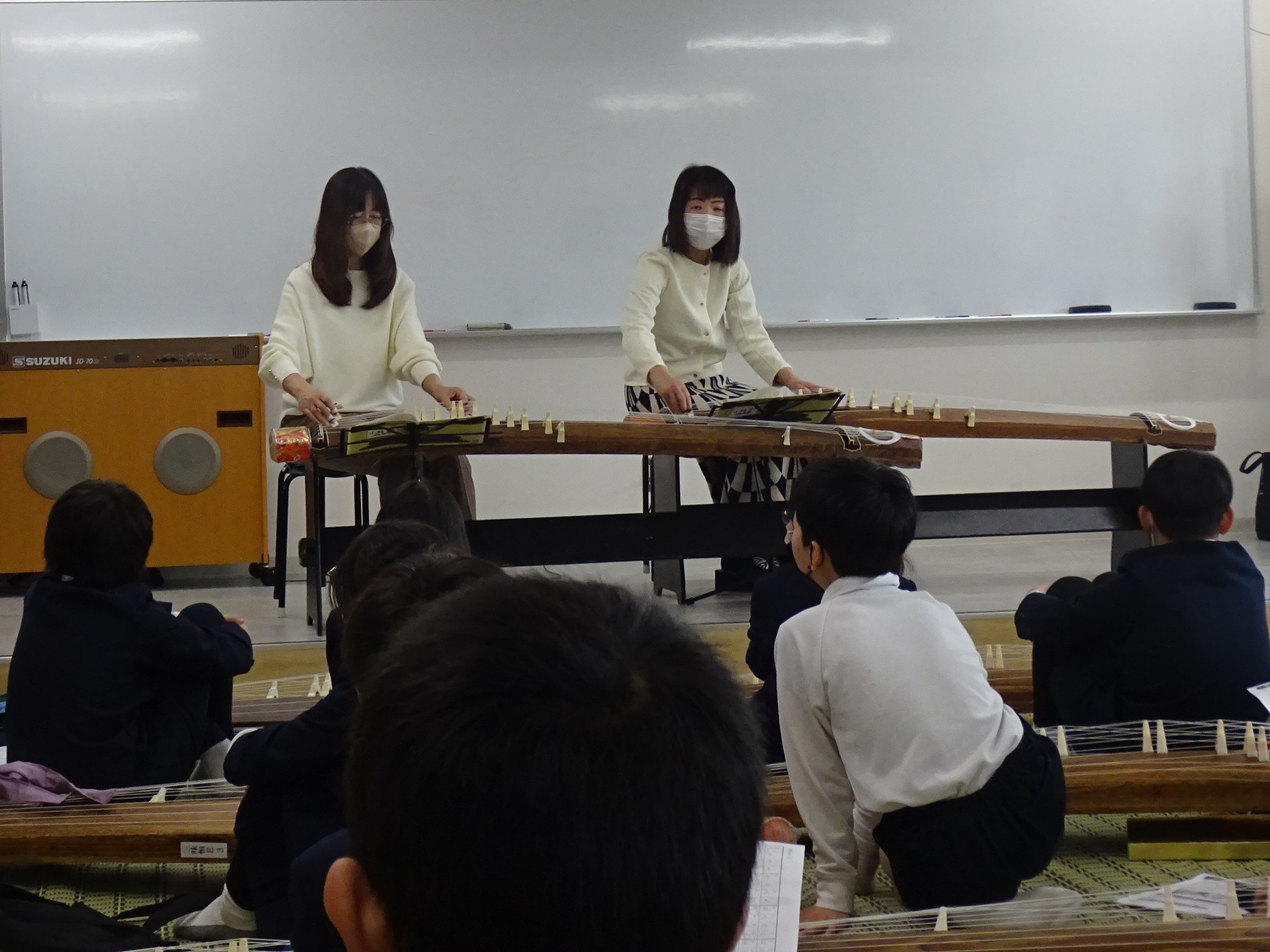 最初に講師の自己紹介があり、次に模範演奏を鑑賞しました。貴重なお箏の生演奏に子どもたちは心を奪われたように聞き入っていました。