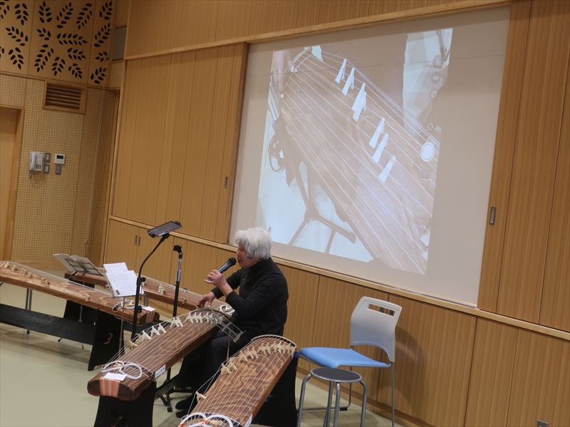 まずは、講師による模範演奏です。『たのしいひなまつり』を会場のモニターに映し出される講師の指の動きを確認しながら、箏の音色に耳を傾けました。