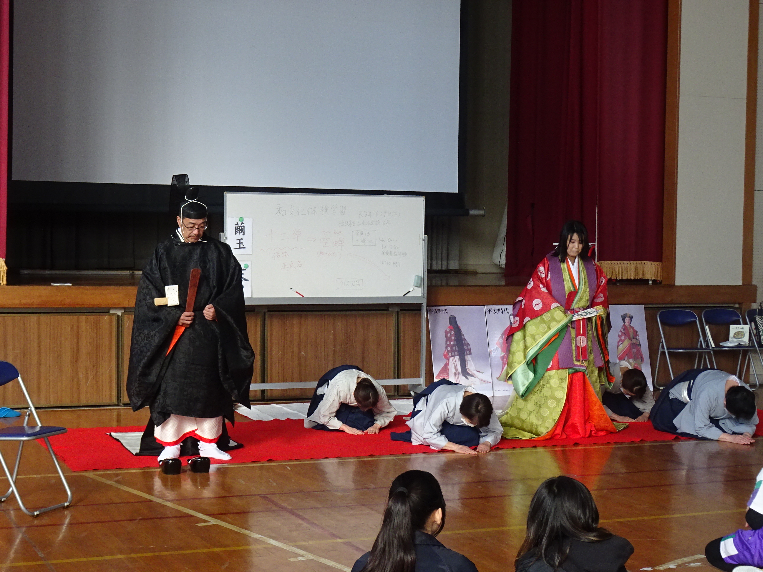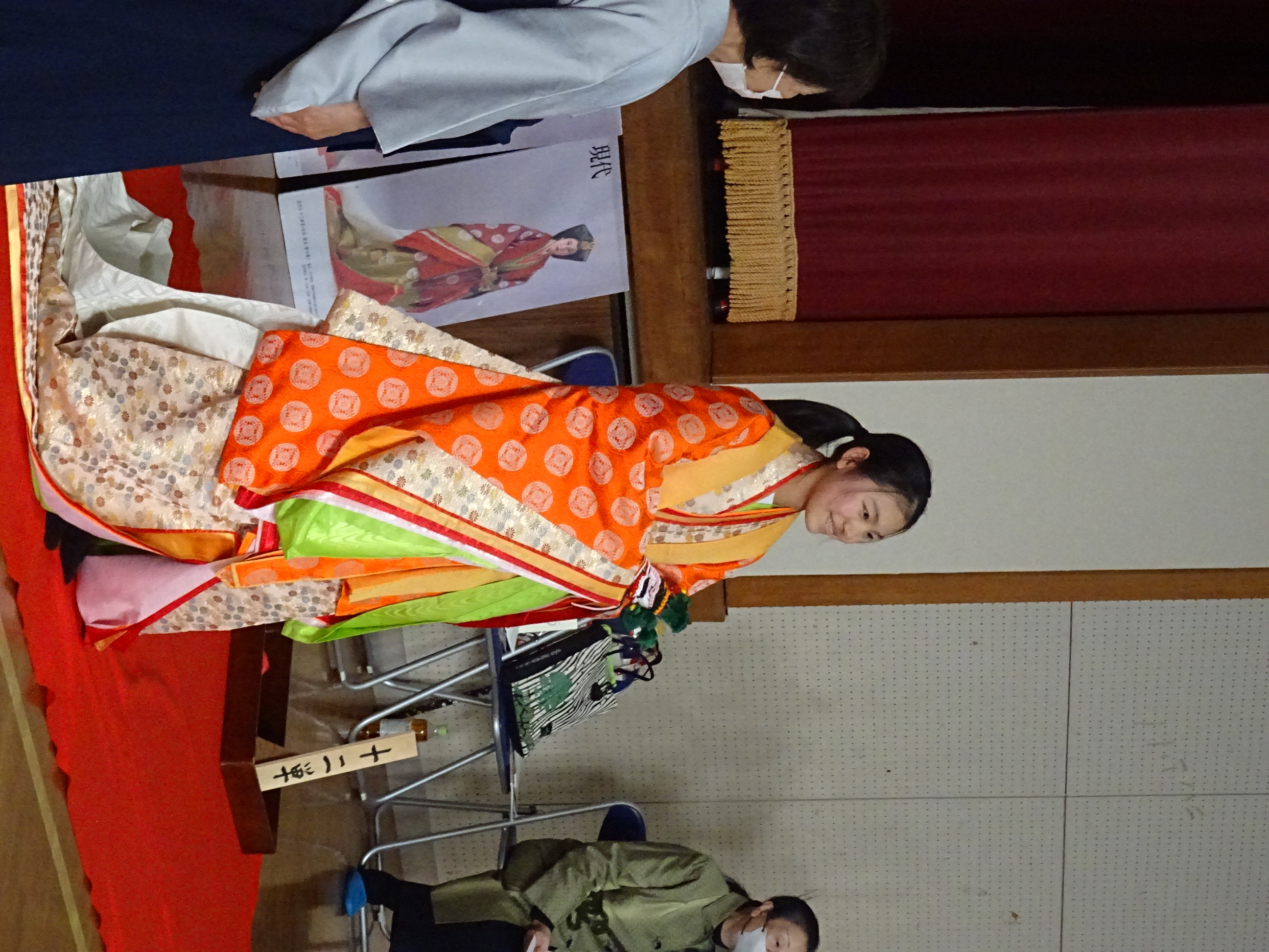 会場に入ると、子どもたちは十二単と束帯を身にまとった担任の先生と校長先生を見つけて、「おぉ~」と歓声が上がりました。