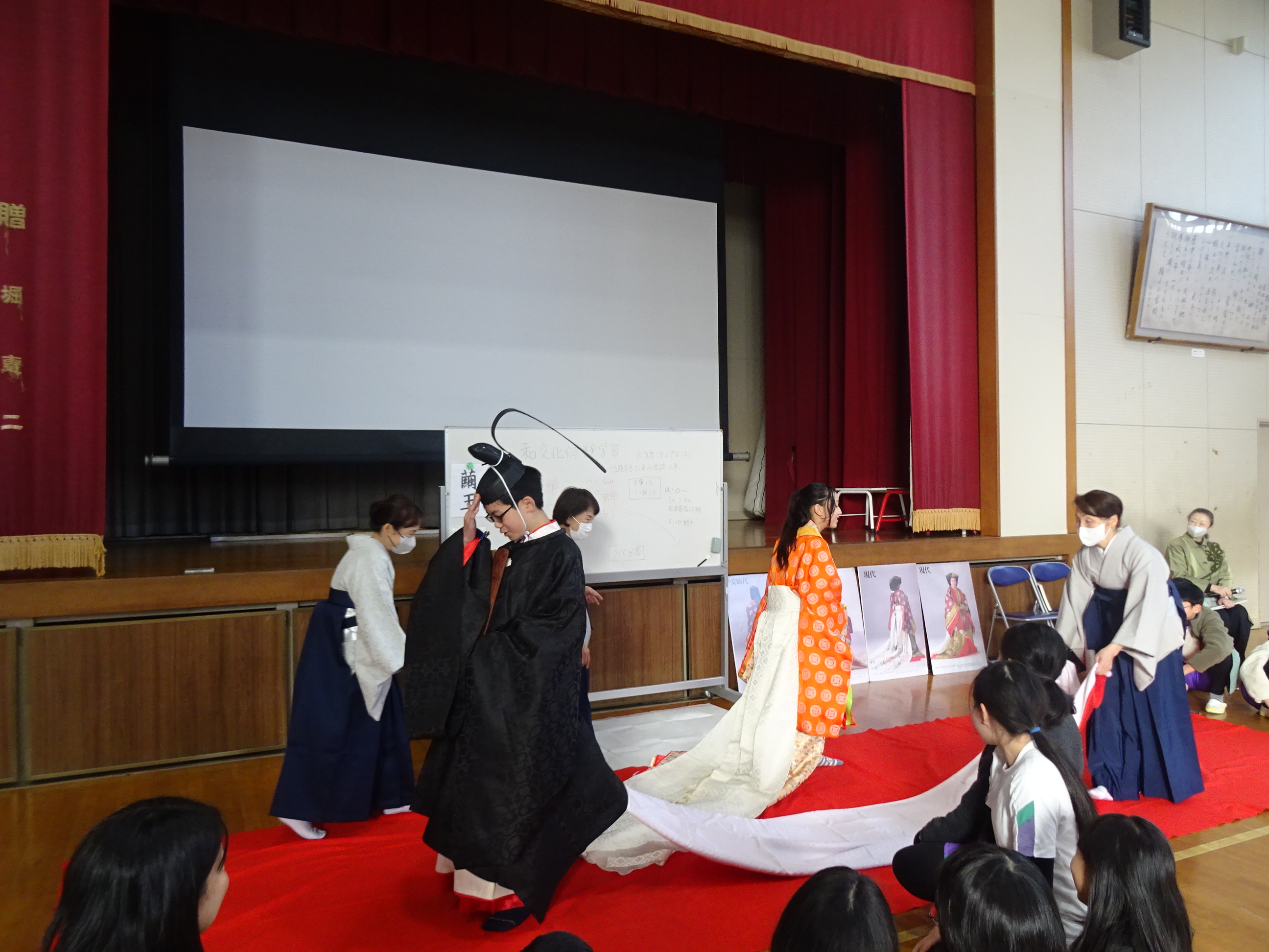 松阪市立揥水小学校6年生のみなさんに「和文化体験学習『平安時代 十二単&束帯の歴史と着装体験』」のプログラムをお届けしました。