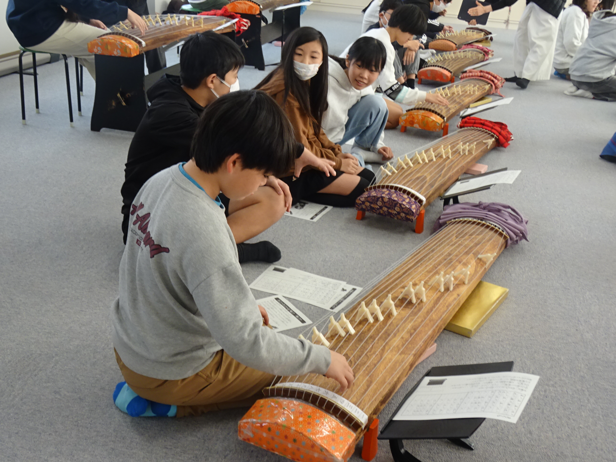 子どもたちは初めてお箏に挑戦するにも関わらず、大きく美しい音色を響かせ、講師からの「とっても上手だね」という言葉に頬をほころばせて嬉しそうに演奏していました。