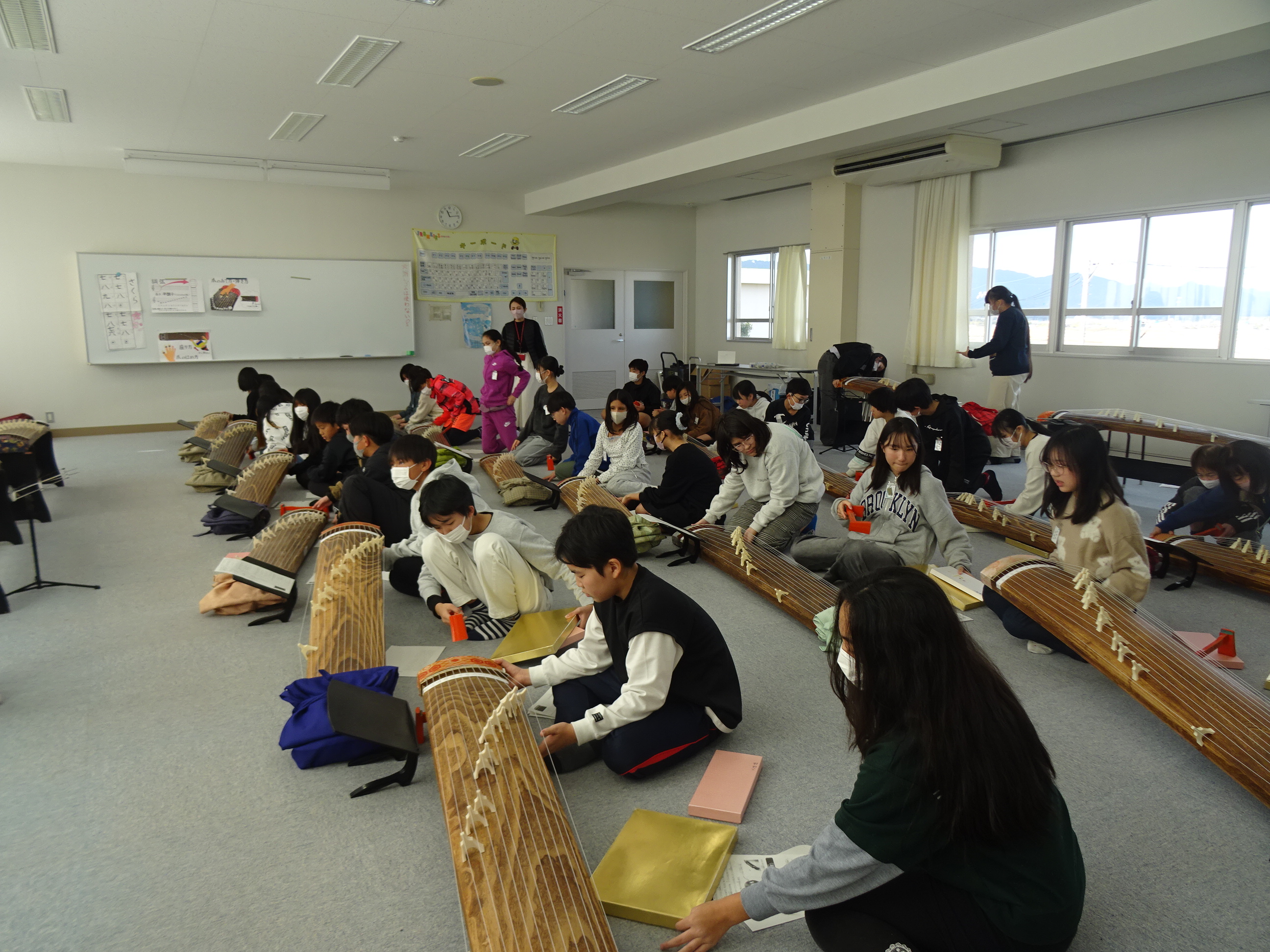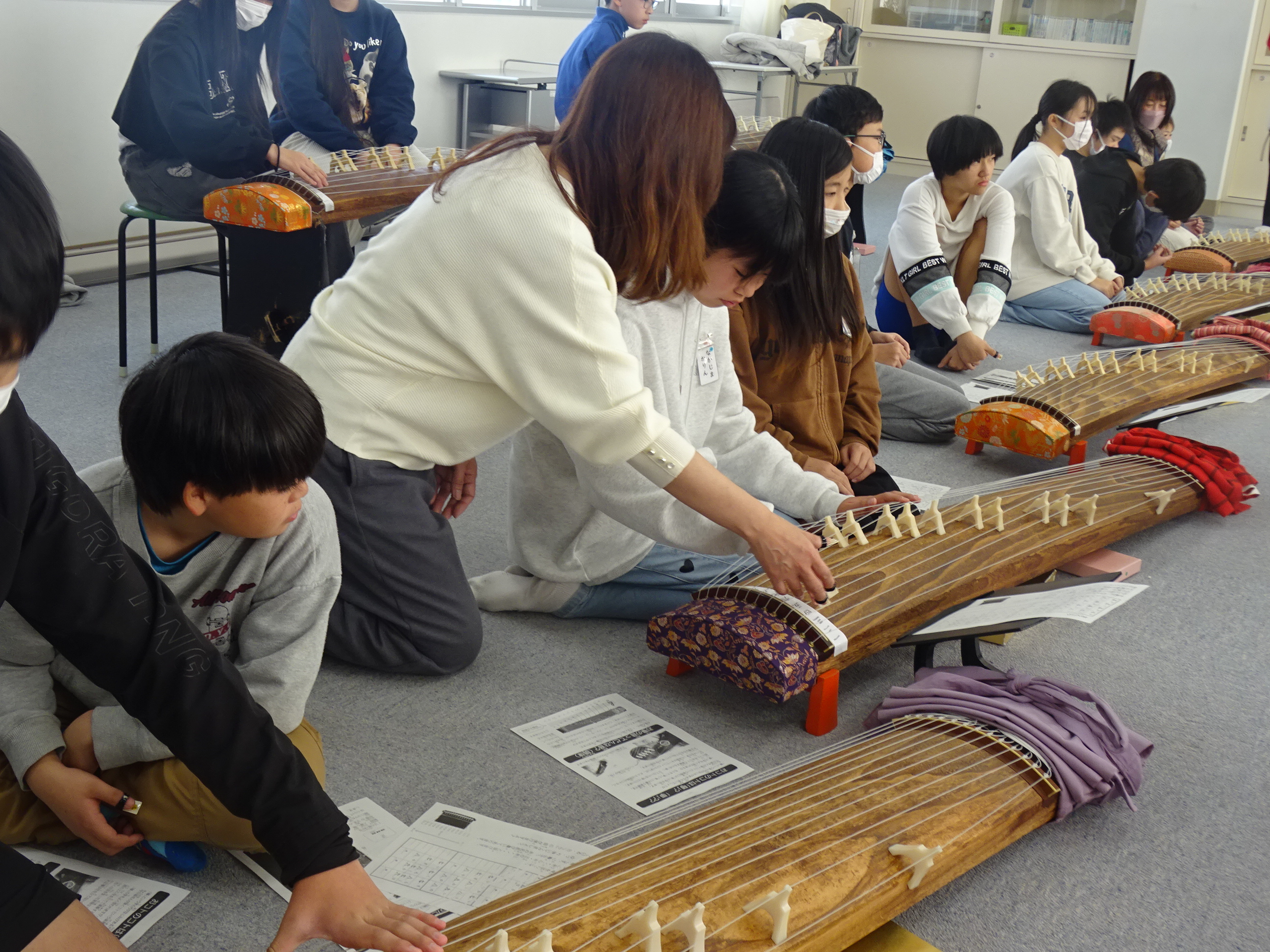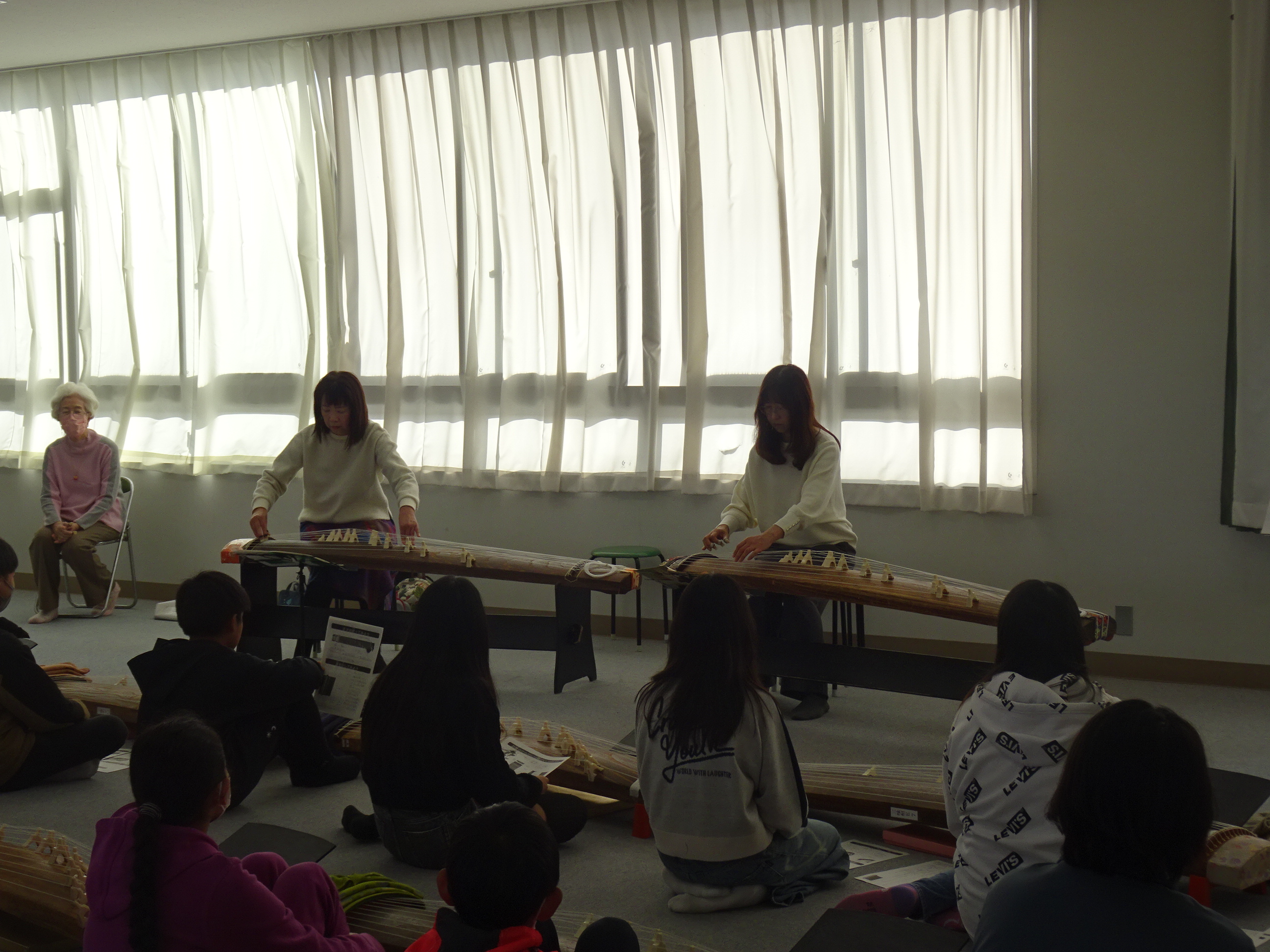 その後、講師からお箏の弾き方や座り方の説明を受け、『さくら』を交代で演奏しました。